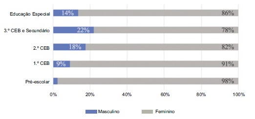 [7] Para o ano letivo 2019/2020, a taxa de feminidade era de 99,1 para o Pré-Escolar; 87,0 para o 1.º CEB; 72,1 para o 2.º CEB e 71,7 para o 3.º CEB e Ensino Secundário, segundo a DGEEC (2021) Estatísticas da Educação.