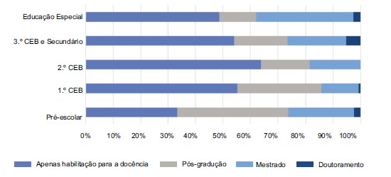 [12] Segundo os dados da DGEEC (2021), para o ano letivo 2019/2020, a distribuição dos docentes com licenciatura (ou equivalente) era para o Pré-Escolar, 77,8%; 1.º CEB, 82,0%; 2.º CEB, 80,9%; 3.ºCEB e Ensino Secundário, 79,6%.