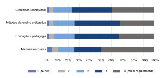 À semelhança do que se encontrou para a formação contínua, a prática de mobilização de conhecimento profissional, neste caso por via de consulta e leitura, aparece com elevada regularidade. Distinguindo-se como o tipo de publicação mais frequentemente consultado os manuais escolares, não havendo diferença assinalável entre as restantes publicações, tal como se pode se pode ler na Figura 6. Apesar da regularidade de consulta, há professores que revelam nunca ou raramente mobilizar publicações. Ora, coloca-se a questão se tal resulta do que Svensson (2006) assinalou, i.e., a possibilidade de descoincidência entre os referenciais publicados e o conhecimento que os docentes considerem adequado para desenvolvimento da sua prática profissional, por não responder aos desafios que contextualmente enfrentam.