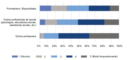 Relativamente à procura de apoio dos professores, os resultados evidenciam que privilegiam o apoio dos que se encontram no mesmo contexto profissional (escola). Os inquiridos revelaram que nos seus quotidianos profissionais recorrem, maioritariamente a outros professores. Os outros profissionais da escola aparecem num plano secundarizado, assim como os de outras esferas profissionais, como se pode ler na Figura 8.