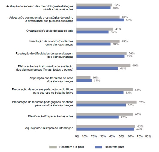 A inquirição mostrou coincidência entre as razões/motivos pelos quais os inquiridos procuram e são procurados por outros docentes. Tal reciprocidade sugere que a aquisição e atualização de informação e a preparação e planificação global da ação dos docentes ocupam mais centralmente as situações de interação profissional, configurando-a, em certa medida. Por ser no âmbito do trabalho desenvolvido entre pares que o conhecimento profissional circula, sendo os próprios professores a fonte do conhecimento mobilizado, como se pode ler na Figura 9. Parece assim evidenciar-se que são relevantes as trocas, apoio e colaboração entre pares e outros, designadamente para a resolução problemas, quotidianamente colocados em contexto profissional (Loureiro, 2005, 2009).
