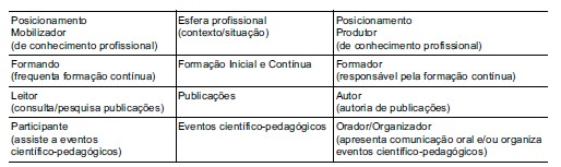 As questões colocadas aos docentes procuraram, como demos conta anteriormente, conhecer as práticas profissionais a partir de situações profissionais de produção, mobilização e circulação do conhecimento profissional. A definição das questões procurou abarcar as 4 fontes de conhecimento enunciadas por Shulman (1986, 1987, 1994), por permitirem que a inquirição dessa cobertura à diversidade de situações e mecanismos de produção, mobilização e circulação do conhecimento. Na Tabela 1 sistematiza-se, para as diferentes situações profissionais consideradas, os posicionamentos definidos, distinguindo entre os de mobilização e os de produção. Exemplifica-se com a primeira situação, a formação, em que se distinguiu entre a ação enquanto formando da ação na posição de formador.