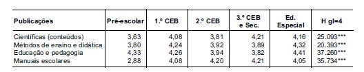 Novamente, encontraram-se diferenças, estatisticamente significativas, na regularidade de pesquisa de todos os tipos de publicações em função do ciclo de educação e ensino, com os resultados do teste de Kruskal-Wallis. Os testes post-hoc permitiram identificar as diferenças estatisticamente significativas. Como se pode ler na Tabela 2, na resposta sobre regularidade de consulta de publicações (em que 1 significa nunca consultar e 5 consultar muito regularmente), os valores médios de consulta destas por tipo, revelou diferenças entre as práticas de consulta dos professores por ciclos de ensino.